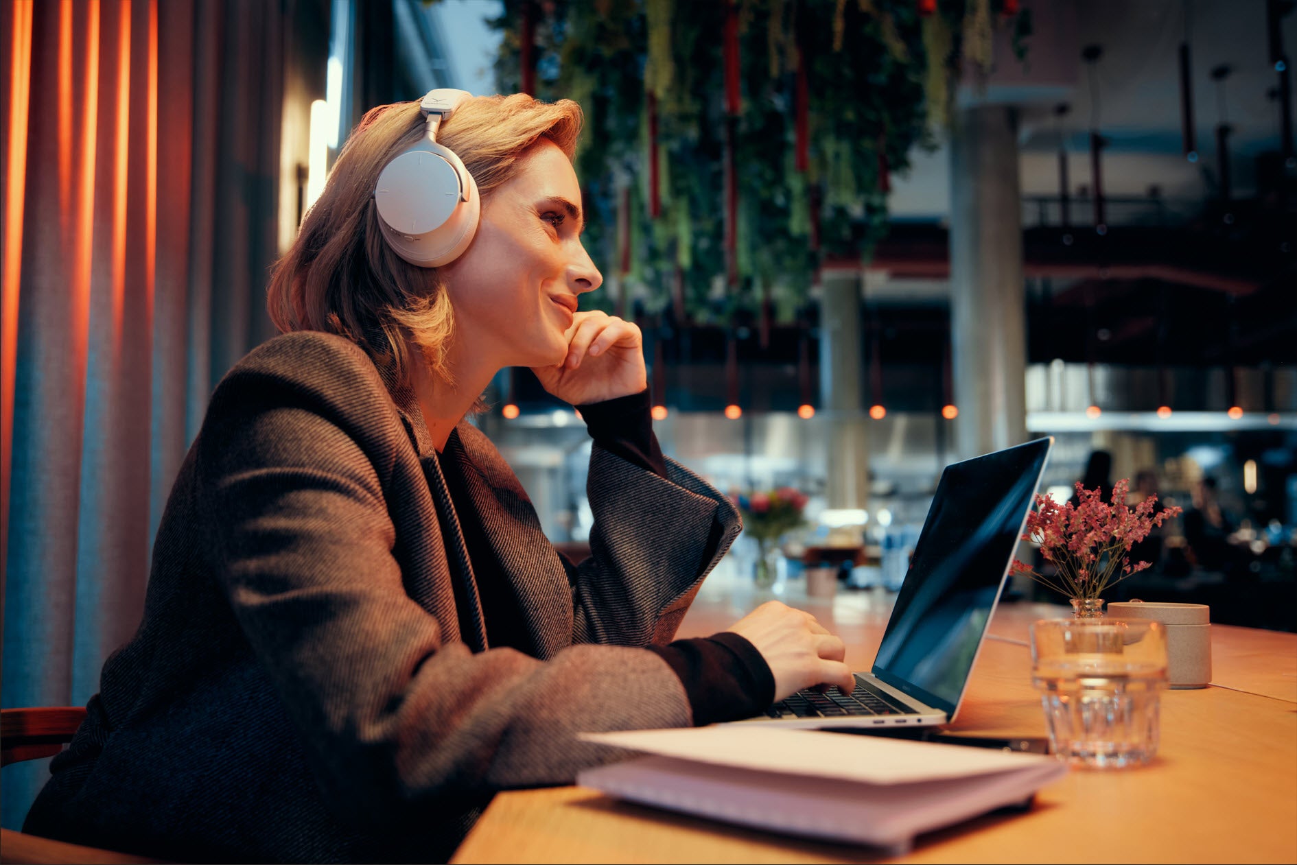 The 45 mm dynamic driver inside the headphones provides a solid foundation for powerful sound, delivering defined highs and rich bass. Depending on whether they want to focus on their work or be aware of their surroundings, users can seamlessly switch between active noise cancellation (ANC) and transparency mode.